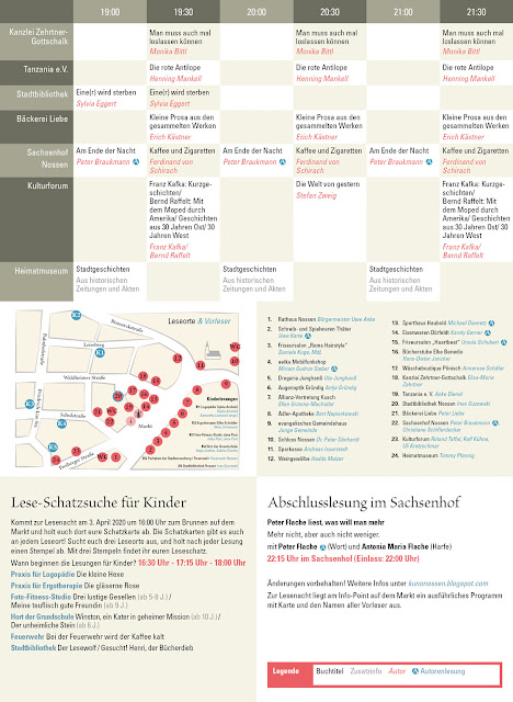 Die Lesungen für Kinder beginnen ab 16.00 Uhr (Treffen beim Brunnen am Markt), die für junge Leute und Erwachsene ab 19.00 Uhr.